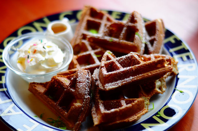 鬆餅烤的很香很酥脆...上面青綠色的是老闆夫妻自己種植的有機檸檬...