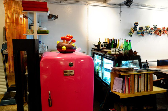 粉紅色的冰箱很吸睛...後方是甜點區和酒區...