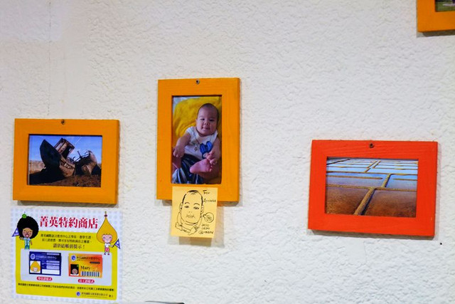 牆上簡單的用法國的照片像框裝飾...中間的BABY是老闆夫妻的小孩阿卡夏...