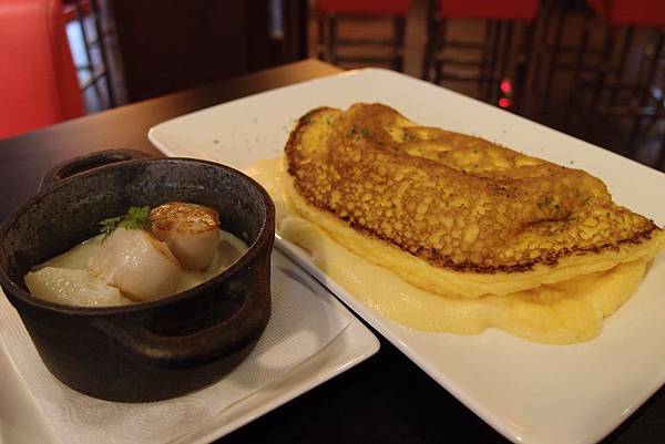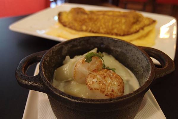 吃舒芙蕾烘蛋要搭配一個小燉鍋...我們選擇干貝燉鍋...馬鈴薯和干貝燉煮的醬汁...海鮮味道濃郁...