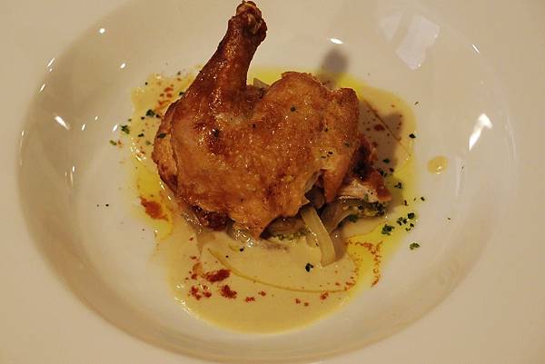 春雞烤到皮酥內嫩...主菜下面的配菜燉煮入味...搭配鵝肝醬汁很match...