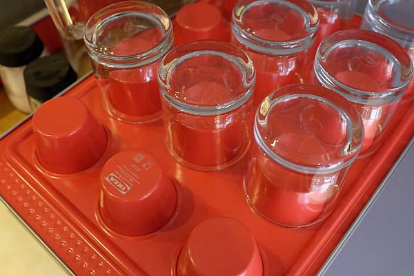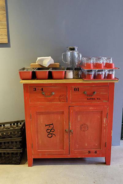 餐具茶水自助...紅色的櫃子相當搶眼...