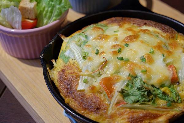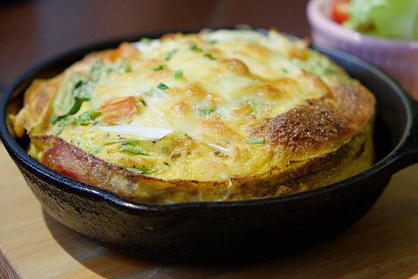 裝滿新鮮蔬菜的蛋汁經過烘烤後呈現一個美麗的蓬度...