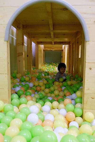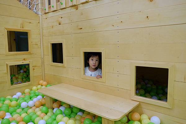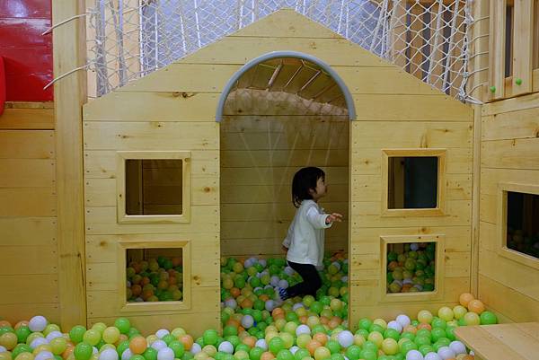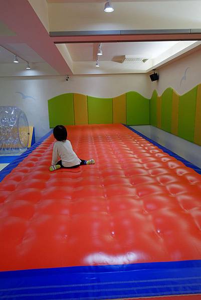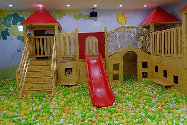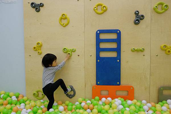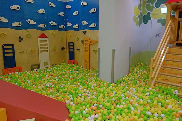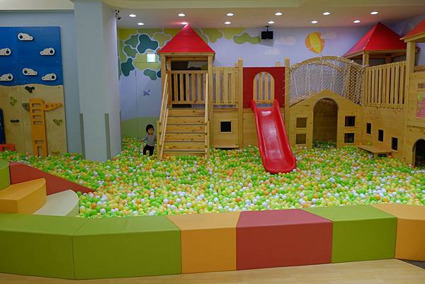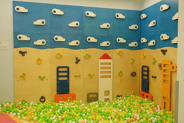一樓的空間有一個超大球池、溜滑梯和室內攀岩場