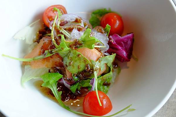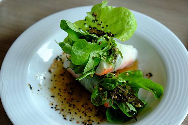 用春捲皮將生菜和蟳味棒包起來...淋上油醋醬...真的是很開味的前菜